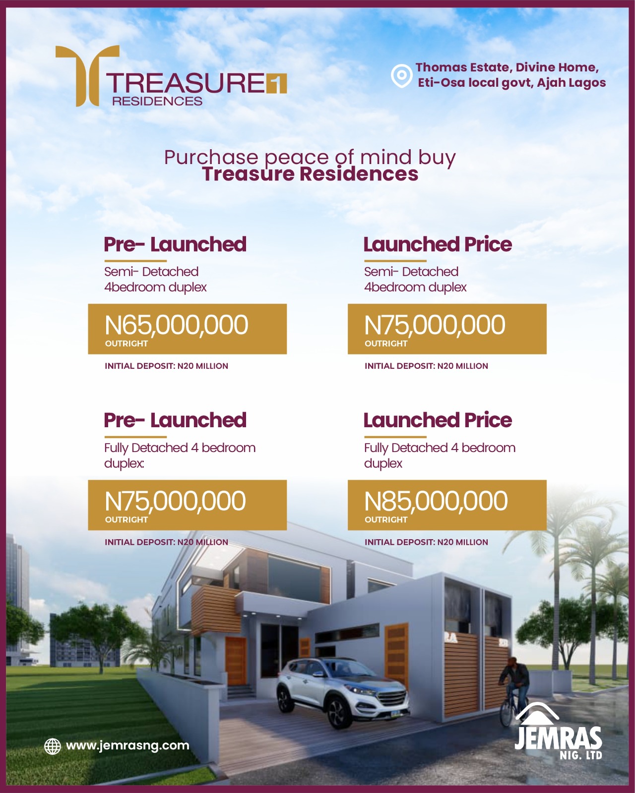 Treasure 1 Residence is a fully sold-out premium estate where modern design meets luxury living. Featuring 4-bedroom semi-detached and fully detached duplexes, the estate offered families comfort, security, and style at affordable pre-launch and launch prices.
